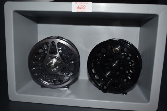 Two alloy 4 and a 1/4 inch Fly reels (look to be unused) one marked Predator line 9/11
