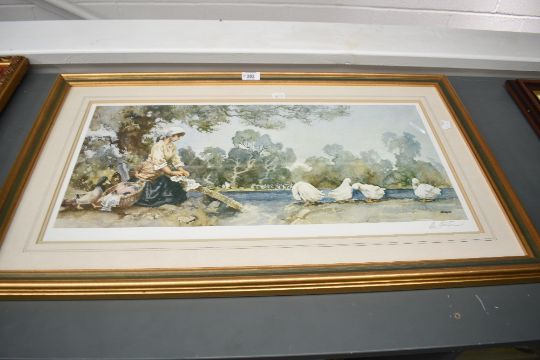 E Sturgeon (British, 20th Century) colour print 'Washerwoman and Geese', signed lower right, within wash line step mount and moulded gilt frame, under glass. 27.5cm x 80.5cm, 48cm x 80cm overall.