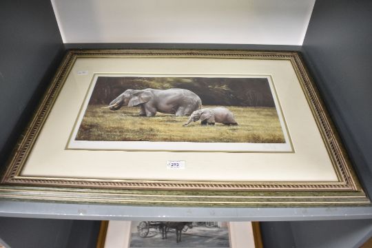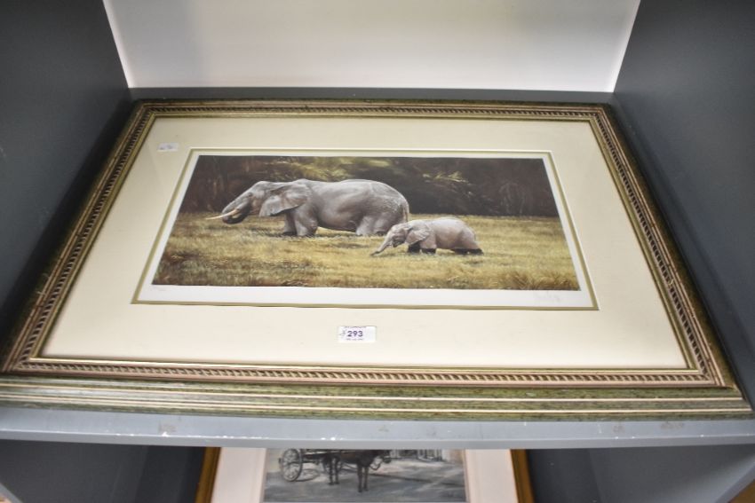 Spencer Hodge (British 1943) limited edition colour print 'Knee High' depicting an Elephant and calf in jungle setting, signed lower right, edition number 170/500, within step mount and moulded green frame, under glass. 22.5cm x 45.5cm, 51cm x 71.5cm overall.