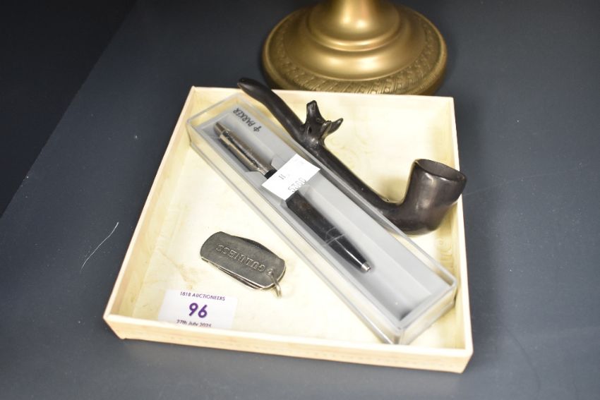 A brass dressing table mirror raised on a circular base, h44cm, sold together with a Guinness folding pocket knife, a Parker pen and a tobacco pipe, (4)