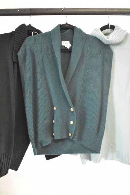 Twelve 1980-90s ladies garments, including a brown Windsmoor trouser suit, a navy micro-polka skirt suit, two collarless plaid jackets, a yellow plaid kilt with velvet waist all from Viyella, and a beige Damart 3/4 length mac. Along with four below-knee skirts in various styles, navy and black. Sizes M-L and Eight pieces of ladies knitwear, including two cashmere V-neck examples, two floral designs, two turtle neck pieces a asymmetric cardigan and a double-breasted lambs wool/angora blend vest. Sizes M-L.