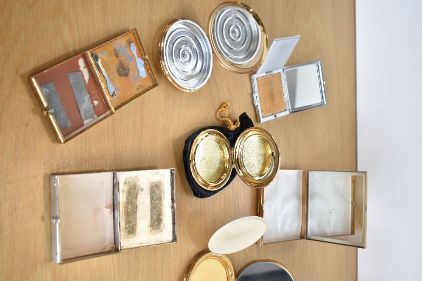 Twelve vintage compacts featuring various jewel and pearl effect embellishments, a range of shapes and sizes, brands include Revlon (with satin case), two Kigu, Majestic Made in USA, a Yardley satinised with puff, box and case, as well as an 'emerald' example in gilt with shamrock sculpted motif.