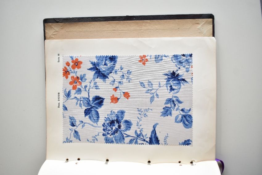 Two 1930-40s fabric sample books, a French containing approximately 850 silk swatches, and a German containing approximately 160, a mix of printed and woven materials, both are more than 80% complete, in lovely interior condition, exterior leather bindings and metal ring-hinge showing signs of age and use. 'Les Tissus A.G.B.' measures 11.5 x 14.2 x 3.5 inches overall, 'Guntramsdorfer Druckfabrik' measures 13.2 x 11 x 1.8 inches overall.