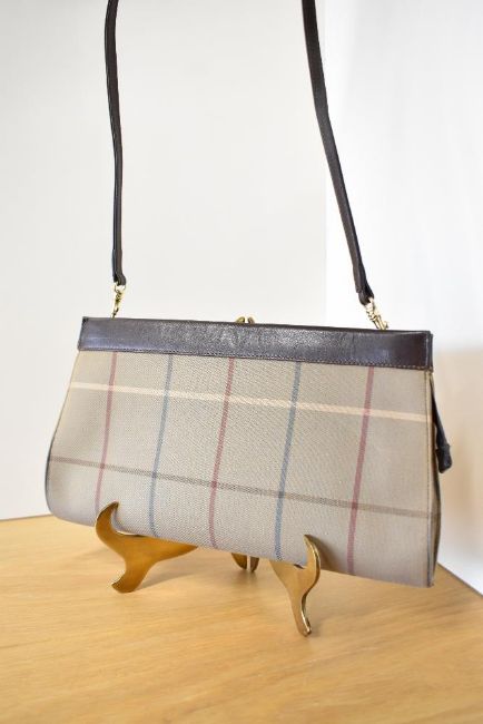 A vintage Burberry cross-body convertible clutch bag in brown leather and plaid cotton canvas, leather lined, having three inner compartments, Made in England, measuring 11 x 7 inches, lovely condition but for one small mark to the canmvas, centre right, pictured.