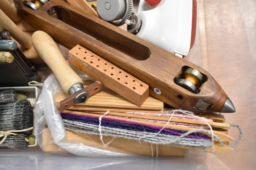 A quantity of 20th century weaving and spinning equipment, including Baron & Hogarth loom shuttle and reeds in various sizes, shuttle wires, wool winders, and fibre brush, among other items. Provenance: local interest, belonged to and spun by the late chairwoman of The Lakeland Guild of Spinners, Weavers and Dyers.