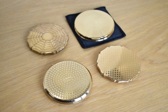 Four 1940-1960s Stratton Made in England compacts, in engine turned gilt metal; two of the 'Stratton Initial' model, one of which in the 'Scone' shape having key, puff, sifter, original mirror labels and semi rigid case in tact. Along with two 'Stratton Princess' shape compacts with the patented self-opening inner catch, one of gryoscope design with the mid 50s - mid 60s star base, the other a radiating flower example with 1940s vertically striped base, having a custom engraving inside which reads 'TO LOUISE WITH MANY THANKS H.I.D.C.'.