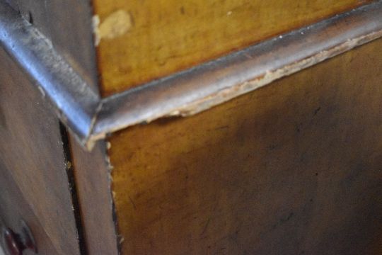 Marks wear and scratches throughout with some damage to cebtral moulding at left side, cut out section to plinth base and replacement pine shelving.