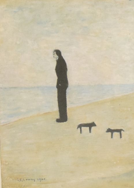 After Laurence Stephen Lowry (British 1887-1976) colour print 'Man looking out to Sea' entitled in print along with ELA blindstamp, within a grey card mount and slender metallic frame, under glass 38cm x 26.5cm & 47cm x 34.5cm overall.