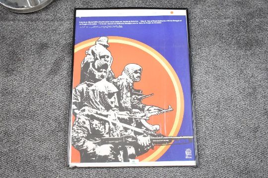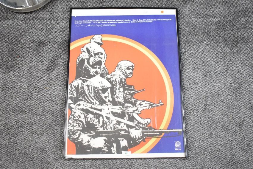 After Gladys Acosta (Cuban 20th/21st century) an Ospaaal (the Organisation of Solidarity with the People of Africa, Asia and Latin America) propaganda poster May 15 Day of World Solidarity with the Struggle of the People of Palestine, within a modern clip frame (with loss to bottom rail and depletion to lower left corner of perspex) 64cm x 49cm (poster dimensions)