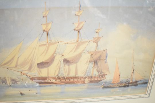 Charles W. Fothergill (British fl.1875–1925) watercolour 'Frigate Drying Sails at Anchor, Zanzibar' c1880, entitled with attribution to hand-written label versi, within a later washline card mount and moulded gilt frame, under glass 30cm x 48cm & 53.5cm x 69.5cm overall. re-framed, had slipped within original frame with visible colour difference to upper portion, possibly signed behind mount.