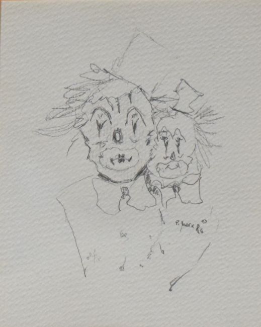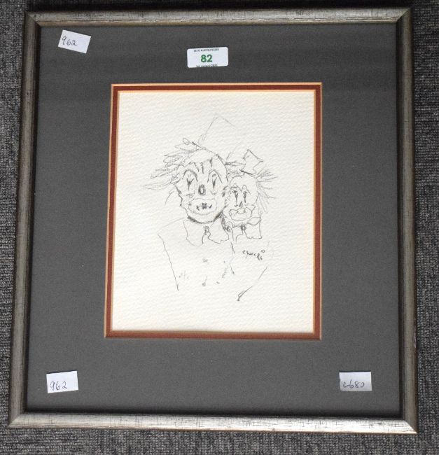 Peter Marx (20th century) pencil sketch, two clowns, signed and dated 86 lower right, within a stepped card mount and moulded silver coloured frame, under glass 21cm x 17cm & 36.5cm x 34cm overall.