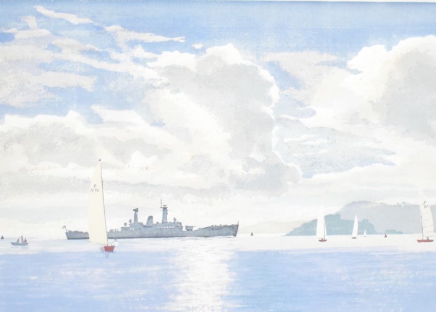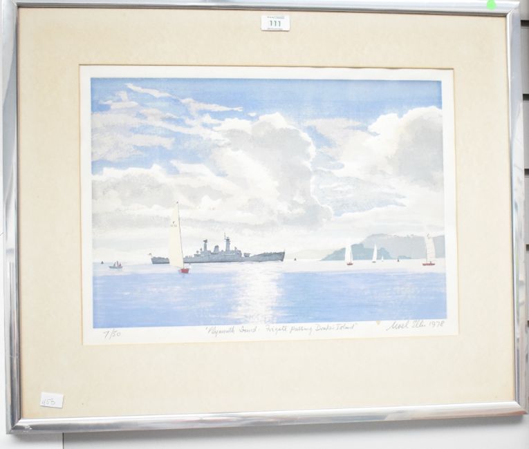 After Noel Ellis (British 20th century) limited edition colour print 'Plymouth Sound: Frigate passing Drake's Island' signed, dated 1978, entitled and numbered 7/50 in pencil to margin, within a card mount and silver coloured metallic frame, under glass 34cm x 47cm & 53.5cm x 65cm overall.