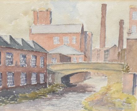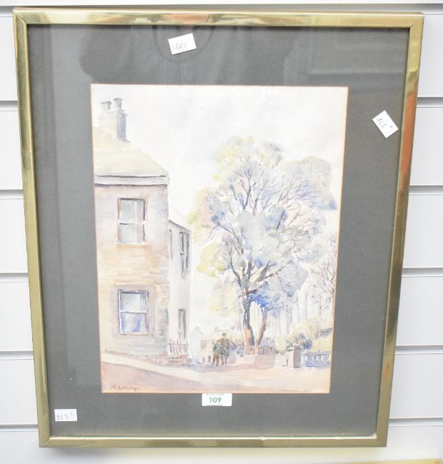 T Collings (British 20th century) two watercolours 'Town Centre Whitworth Nr Rochdale, Lancs' and 'The Canal Oldham Road, Lancs' the larger signed lower left, the smaller appears to be signed under mount, within grey card mounts and slender metallic frames, under glass, largest 36cm x 27cm & 51.5cm x 42cm overall.