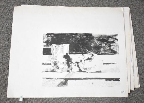 Artist unknown, a group of seven monochromatic prints, still life study, unsigned, unframed, 55cm x 68cm overall.