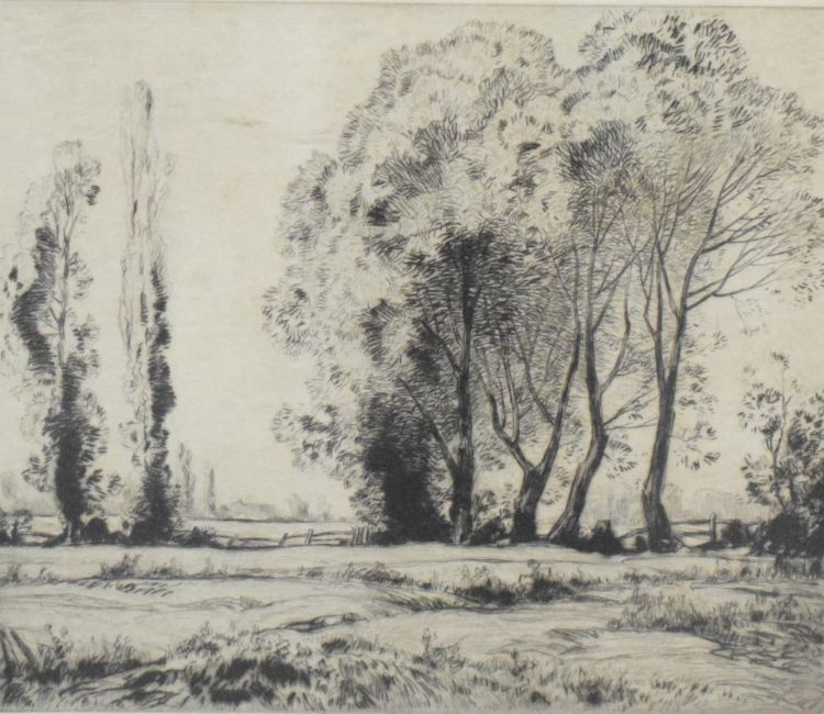 After Harry Harvey Clarke (British 1869-1948) monochrome engraving 'Sunny Meadows' signed and entitled in pencil to margin, within a broad card mount and slender ebonised frame, under glass 19cm x 21cm & 47cm x 39cm overall.