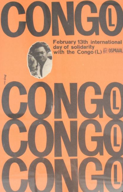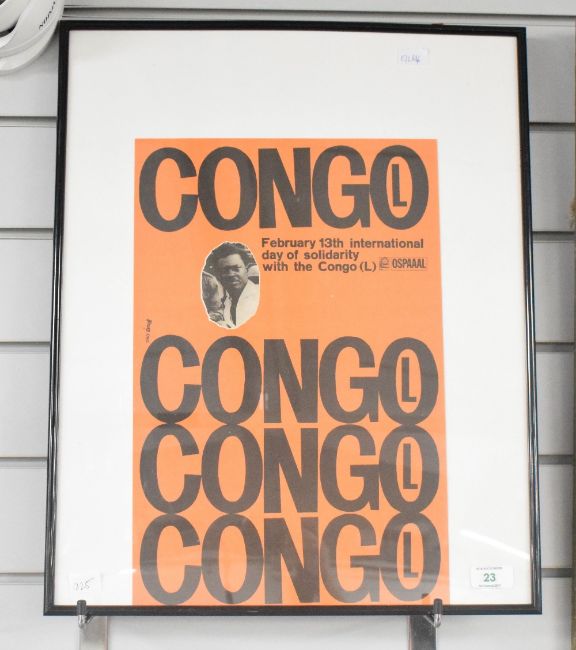 After Tony Evora (Cuban b.1937) a vintage Cuban OSPAAL (Organization of Solidarity with the People of Asia, Africa and Latin America) propaganda poster, Congo February 13th International day of solidarity with the Congo (L) within an oversized clip frame, under perspex 40cm x 26.5cm (poster dimensions)