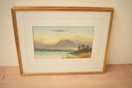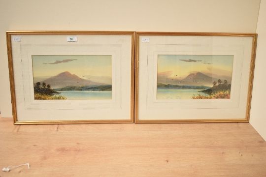 Tom Williams (20th century) a pair of Scottish loch scene watercolours, signed lower left and right and within washline card mounts and moulded gilt frames, under glass 17cm x 29cm & 35cm x 46cm overall.