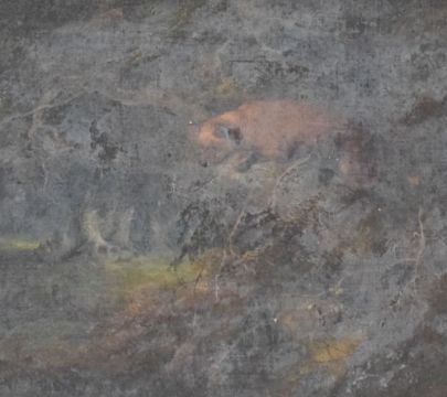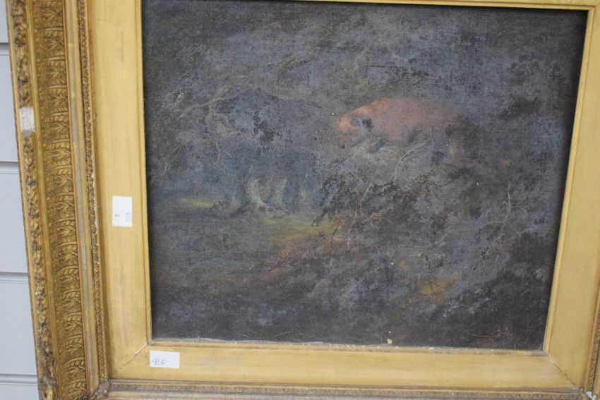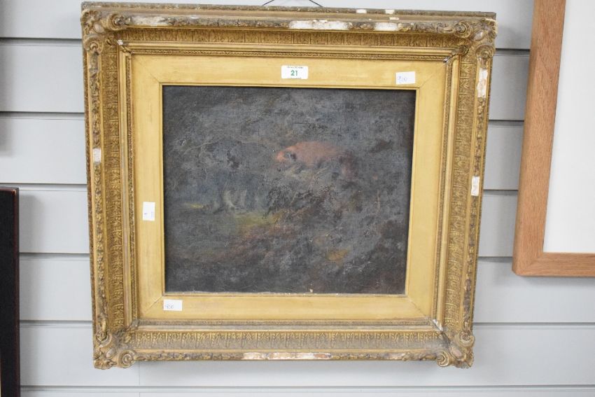 A 19th century English school oil on canvas, fox stalking a pheasant within a woodland setting, within a gilt slip and giltwood and gesso frame, 29cm x 34cm & 49cm x 55cm overall. Requires cleaning, much of the painting is obscured by surface accumulations, possibly signed but not currently visible.