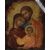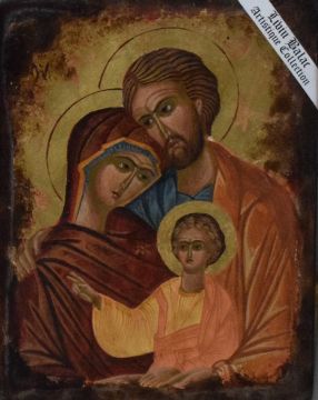 Two modern Romanian hand-decorated wooden panel religious icons, the larger depicting the virgin Mary with Jesus, 33cm x 26cm the smaller Mary, Joseph and Jesus 25cm x 19cm