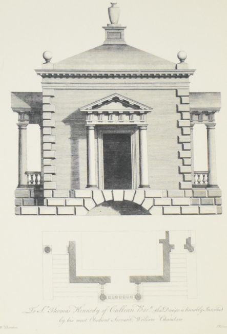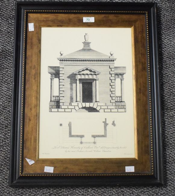 After William Chambers (British 1723-1796) decorative reproduced print of an architectural drawing, originally featuring in William Chambers's A Treatise on Civil Architecture' within a gilt slip and moulded frame, under glass 40.5cm x 28cm & 57cm x 45cm overall.