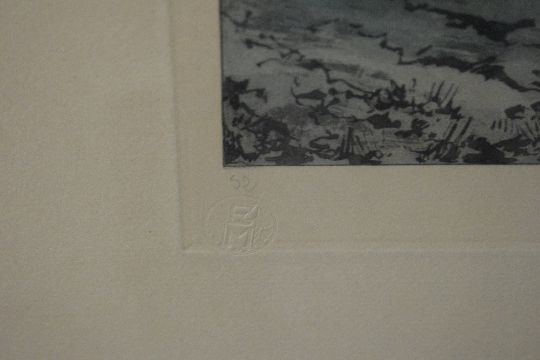 After Andre Delaistre (French 1865-1931) 1920's couloured aquatint, rural scene with figures and buildings, signed and numbered 52 in pencil to margin along with EM blindstamp, within a slender gilt frame, under glass 69cm x 58cm overall. Sold together with a modern limited edition colour print depicting a robed female figure, numbered 193/250, indistinctly signed, within a broad card mount and modern silvered frame, under glass 26.5cm x 9cm & 51.5cm x 33.5cm overall.