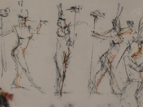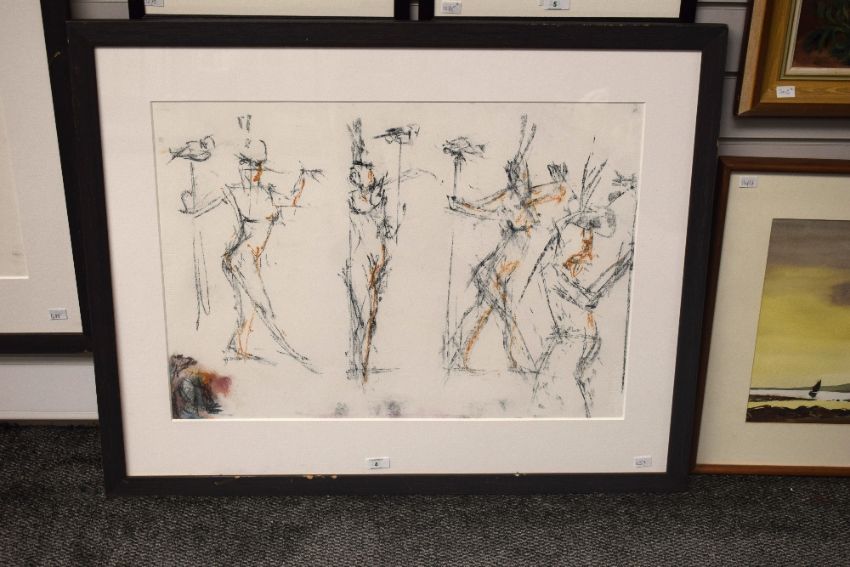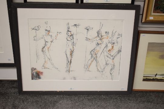 Artist unknown, pastels on Fabriano paper, surrealist sketch of figures in motion, within a broad white card mount and grey painted wooden frame, under glass 48.5cm x 69cm & 72.5cm & 90.5cm overall. Some marks to frame.