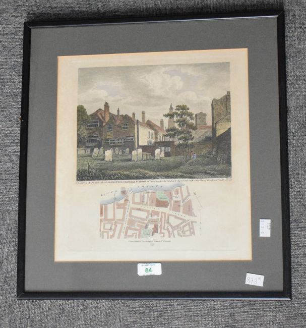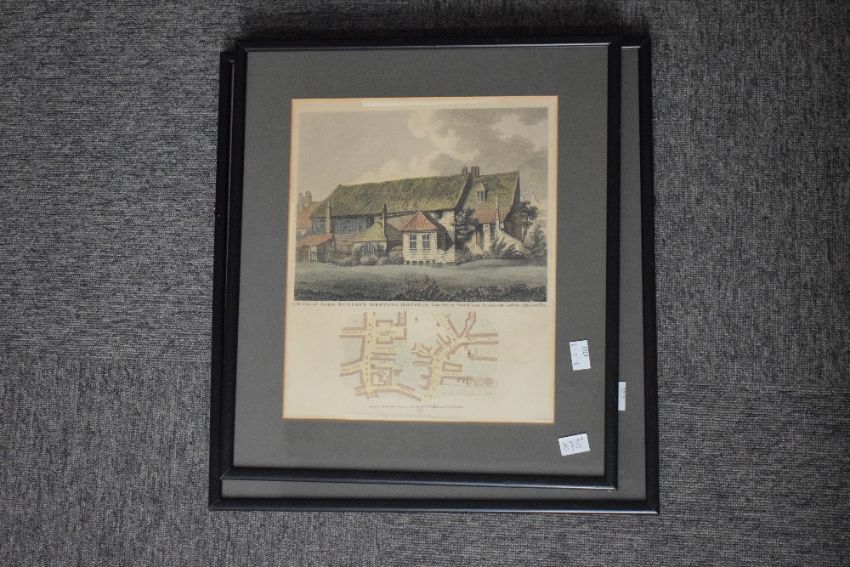 After Robert Blemmell Schnebbelie (British 1781-1847) and William Wise (fl 1815-20) a hand coloured engraving A South View of Queen Elizabeth's Free Grammar School, in Tooley Street, with a street pan of the adjacent neighbourhood, published 1st Dec 1843 by Robert Wilkinson, No 58 Cornhill, sold together with a similar hand-coloured engraving E.S.E View of John Bunyan's Meeting House in Zoar Street with the adjacent plan, each mounted and framed under glass 33cm x 30.5cm & 42cm x 45cm overall & 30cm x 25cm & 42cm x 37cm overall.