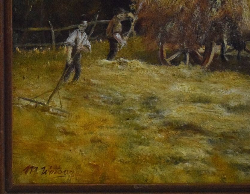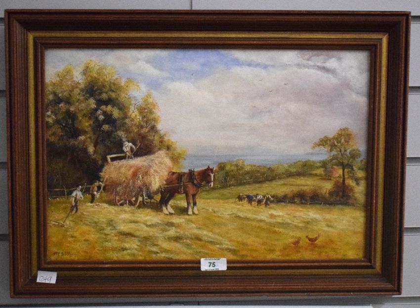 M Watson (20th century) oil on board, bygone harvest scene, signed lower left, within a moulded frame, 29cm x 44cm & 39cm x 54cm overall.