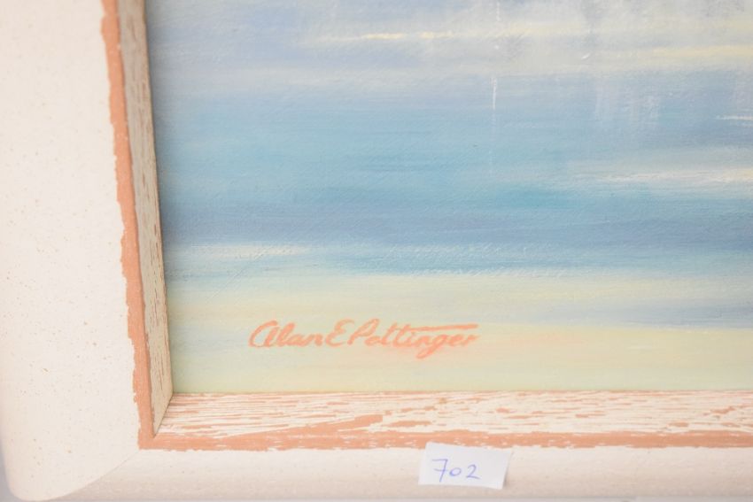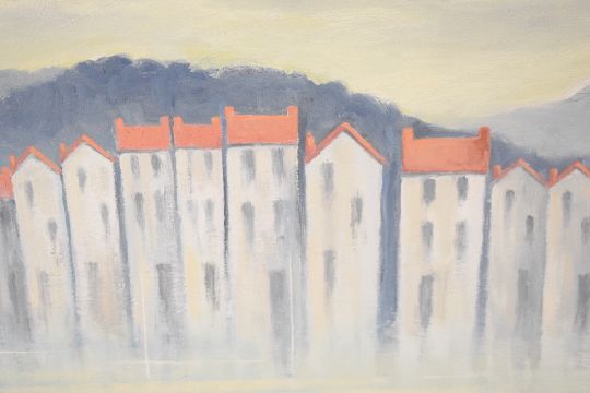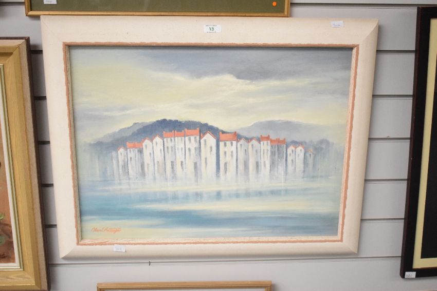 Alan E Pettinger (British 20th/21st century) oil on board 'Lakeside Village' signed lower left, entitled in ink verso, within a moulded distressed effect frame, 44cm x 59cm & 55cm x 70cm overall.