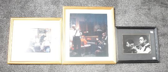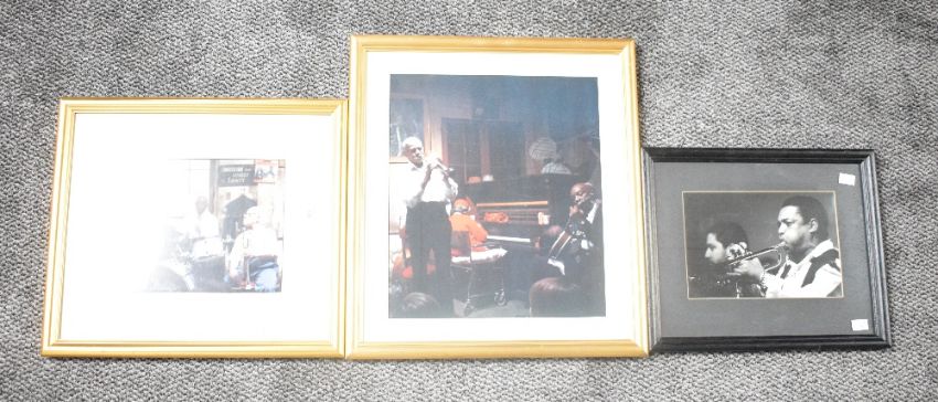 Photographer unknown, a group of three photographic prints, American Jazz musicians, two being in colour and one black and white, each mounted and framed, largest 50cm x 45cm overall.