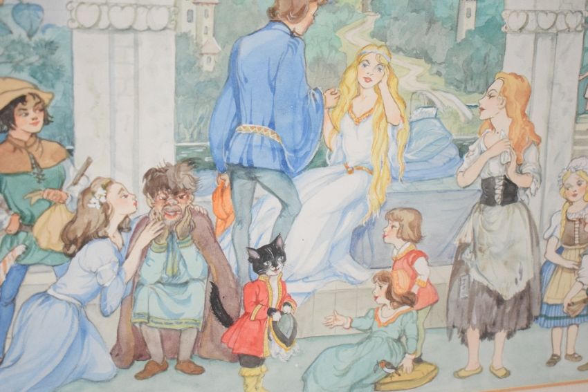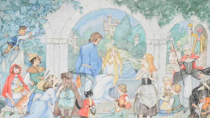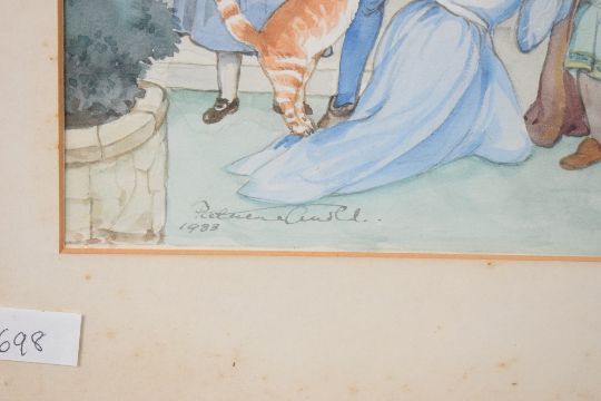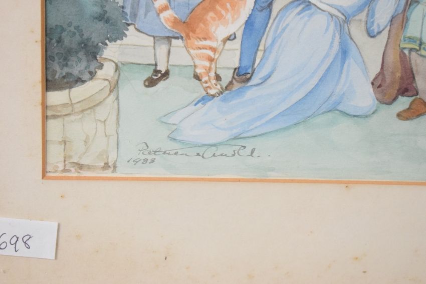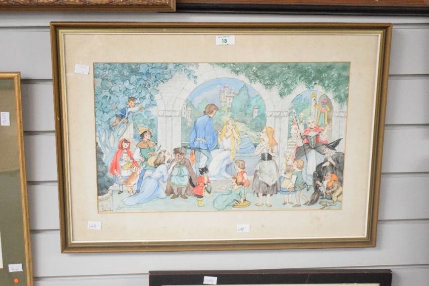 Patience Arnold (British 1901-1992) watercolour, fairy tale scene with various recognisable characters within a garden folly setting, signed and dated 1983 lower left, within a card mount and moulded gilt frame, under glass 29.5cm x 49cm & 45.5cm x 63.5cm overall.