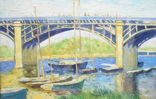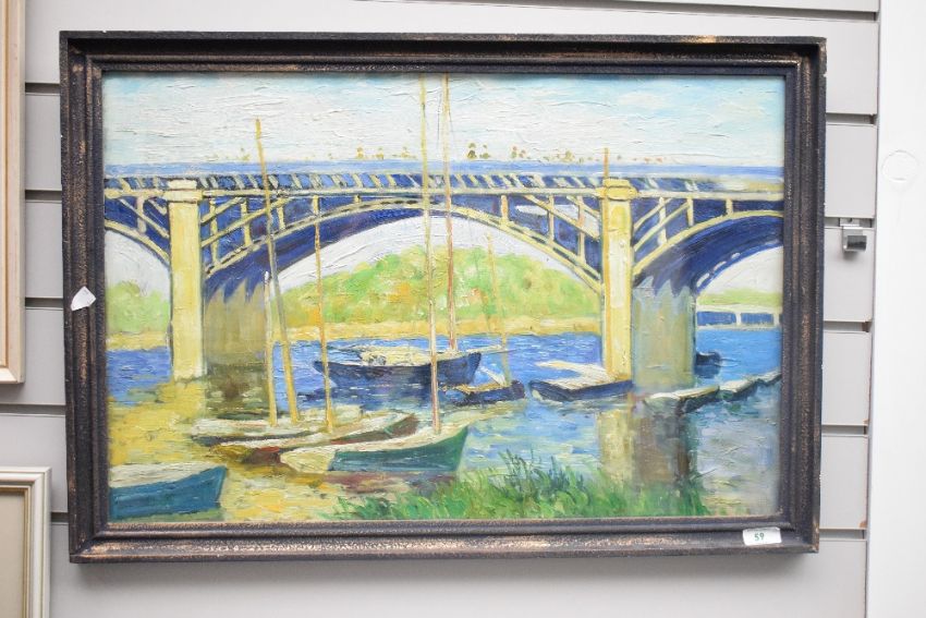 Artist unknown, after Claude Monet (French 1840-1926) impressionist oil on board, decorative copy of 'The Seine Bridge at Argenteuil' unsigned, within a moulded frame, under glass 42cm x 63cm & 48cm x 69.5cm overall