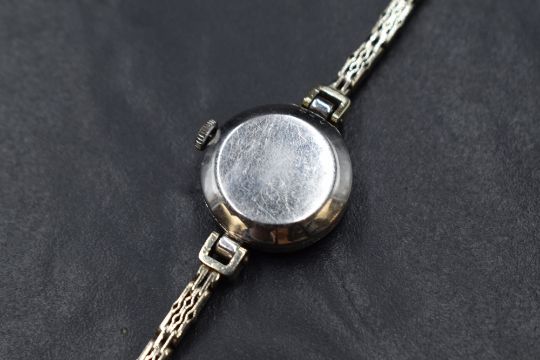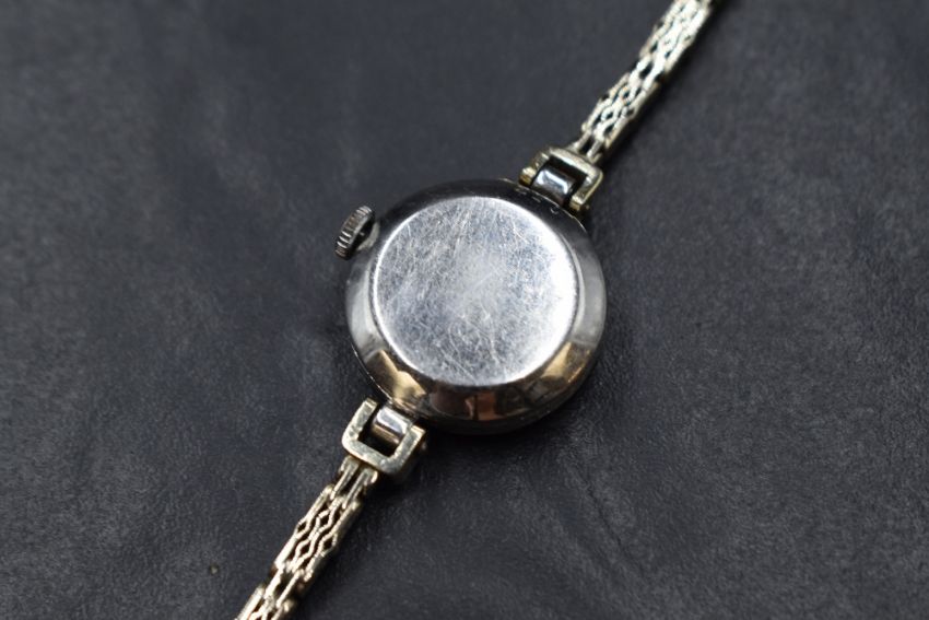 An Art deco platinum & diamond mechanical cocktail watch with 9ct white gold bracelet strap, the watch having a Swiss movement with Arabic dial to small white face within a decorative platinum case with diamond set bezel having thirteen old cut diamonds totalling approx 3.33ct in a milligrain setting, on a later 9ct white gold articulated decorative link bracelet strap, approx 185mm long & 17.9g gross, diamonds bright and fairly clear, watch not working and glass scratched
