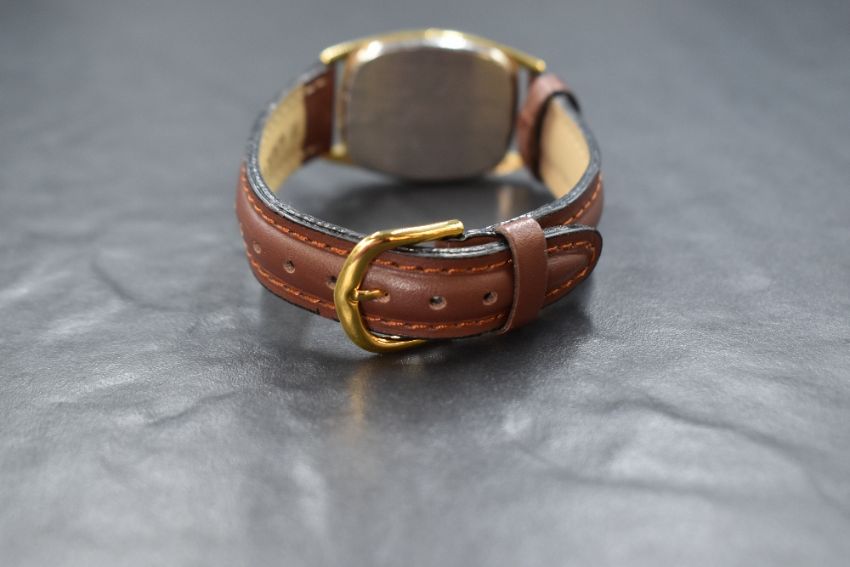 A lady's Omega De Ville quartz wrist watch of rectangular form having a Roman numeral dial in a gold plated case with rope twist detail and tan leather strap, case width approx 27mm, movement numbered 1365 and inside case back signed 'omega' watch not working