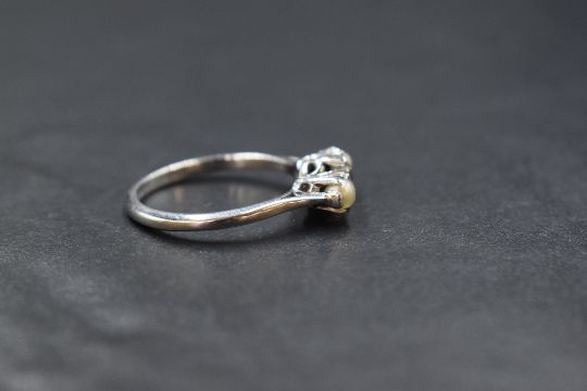 An 18ct white gold pearl and diamond set trilogy ring, the central old cut diamond measuring approximately 0.33ct, flanked by two seed pearls, marked 18ct, ring size O-P, 3.2g. Some slight damage to girdle of diamond