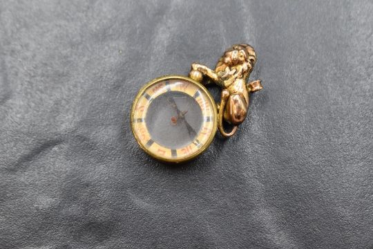A 9ct rose gold compass fob having a moulded lion terminal, pointers present but loose, approx 5.4g gross