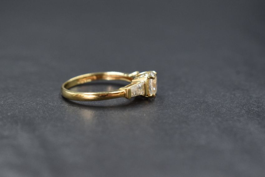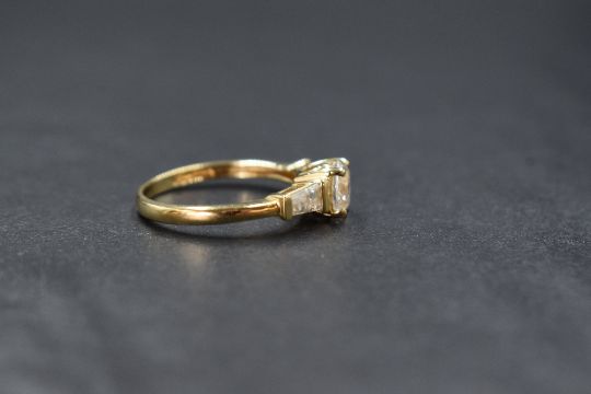 A 14ct gold cubic zirconia ring by QVC having a central stone in a 4 claw raised mount within gem set shoulders on a 14ct gold loop, size M & approx 2.4g