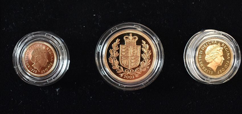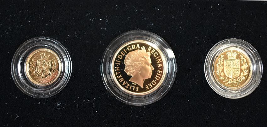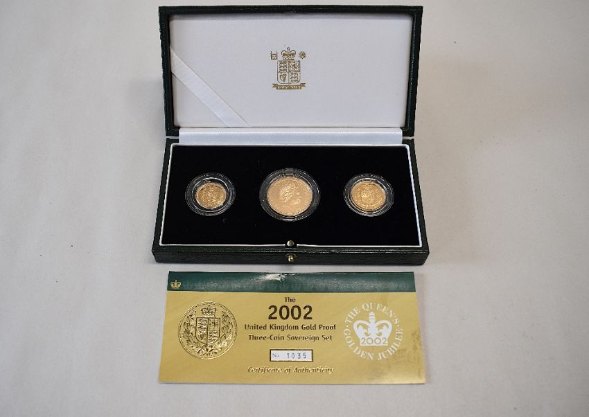 Gold Proof Three Coin Sovereign Set, Queen Elizabeth II 2002 comprising, Two Pound with Crowned Shield on reverse, One Sovereign with Crowned Shield on reverse Half Sovereign with Crowned Shield on reverse, Limited Edition 1035/5000, all in plastic capsules in one fitted case with folding certificate present, Combined weight of Three Coins 28g