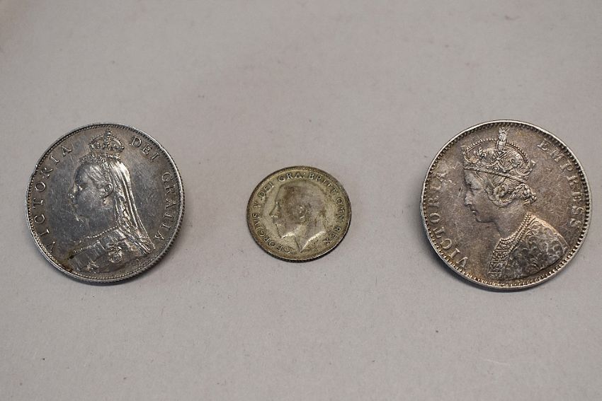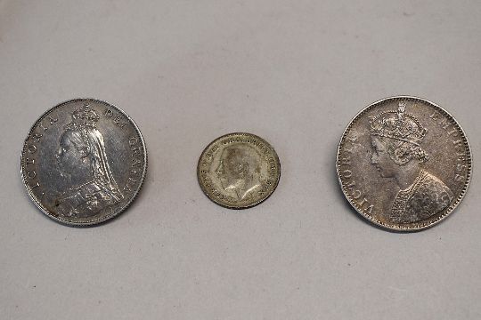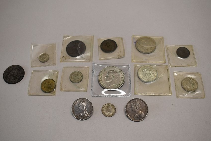 Queen Victoria 1887 Jubilee Head Silver Florin Broach, Queen Victoria 1895 Silver One Rupee Broach, 1937 George VI Silver Crown, Halfcrown, Two Shillings, One Shilling, Sixpence, Threepence Silver Alloy and Threepence Brass, Penny, Halfpenny and Farthing. 1922 George V Silver Sixpence, 1942 George VI Silver Halfcrown (14)