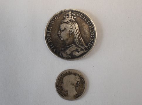 Queen Victoria 1889 Jubilee Bust Silver Crown, Victoria 1884 First Head One Shilling (2)