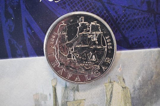 Mixed Coinage and Medals, Jersey 1861 1/13th of a shilling, possible Roman Coin being very worn, Russian Victory Medal over Germany 1941-1945, missing loop, 1890 Queen Victoria GB Silver Crown in fitted case, London Mint 2006 Trafalgar Five Pound Coin on card, A War To End All Wars card folding case containing one Cupro-nickel Crown and a Bradford Exchange Lest We Forget Cupro-nickel Five Crown Coin in plastic capsule in fitted case