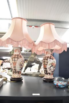 A pair of ceramic 'Imari' pattern table lamps with shades, decorated with geometrical and floral designs on a white ground, h50cm overall