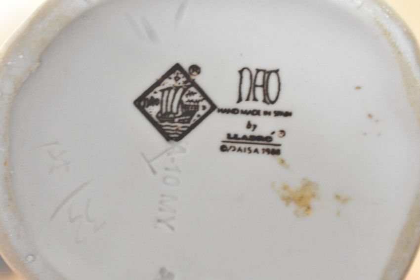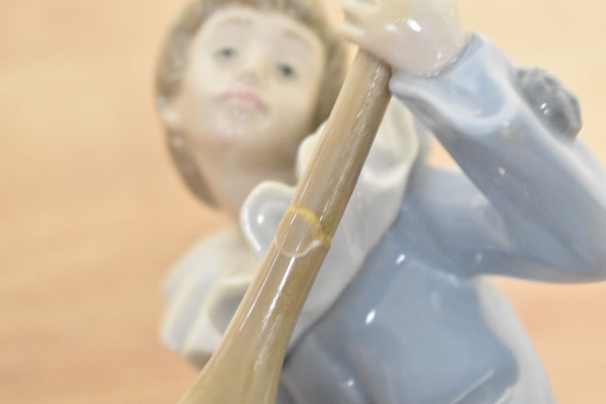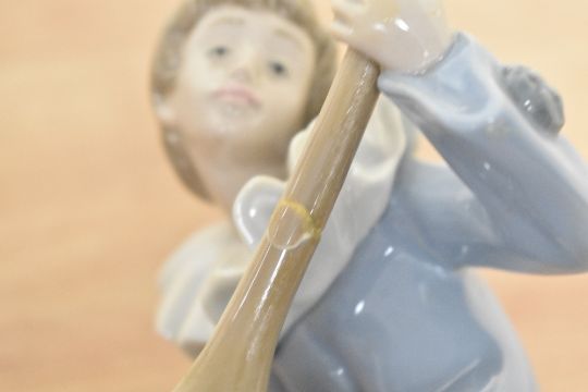 A group of three Nao by Lladro porcelain clown musician figurines in white, yellow and blue garments.