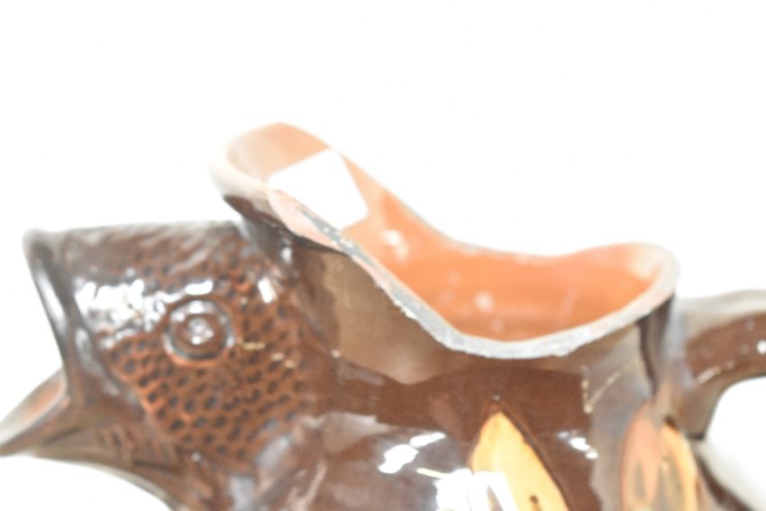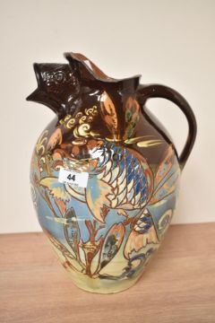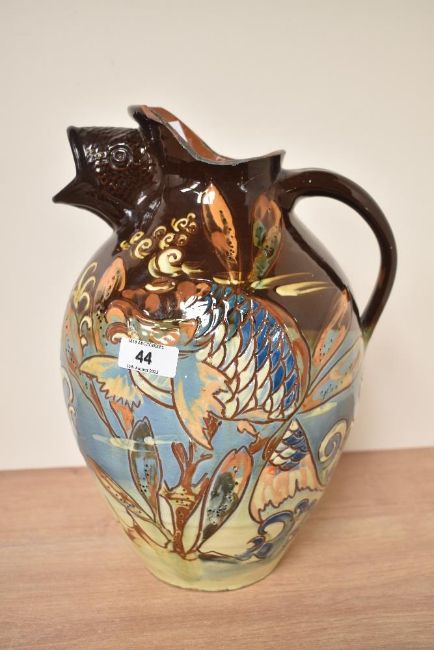A C H Brannam vase of ovoid form having fish shaped spout and mottled style decoration, signed to base, h31cm