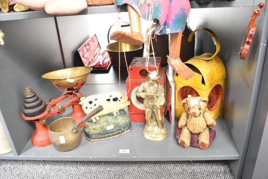 Two railway lamps, h26cm, sold together with two door porters, a copper pan, a brass figure and a weighing scale