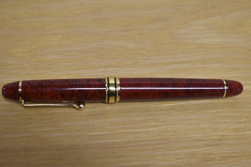 A Parker Duofold Lucky Curve button fill fountain pen in Mauve Moire with a two cap bands on a ringtop having Parker Lucky Curve Pen made in USA nib