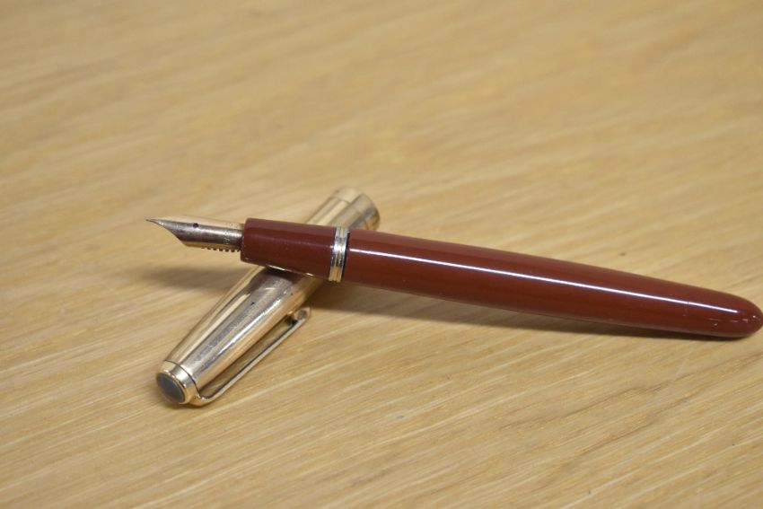 A Parker VP button fill fountain pen in Rust with a Rolled Gold cap having a Parker USA nib