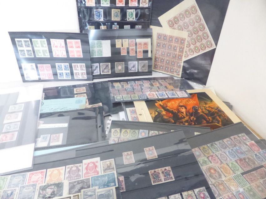 RUSSIA + SOME UKRAINE - COLLECTION OF MINT AND USED EARLIER MATERIAL, TRIDENTS WHITE RUSSIA EC Good sized lot of Russian material including Russian stamps optd with Ukraine Tridents, White Russia material, ranges of earlier perfs and imperfs, various blocks and multiples, folder of mid 1950's Russian material including odd mini sheet, several full sheets MNH from 1960's and numerous stockcards/sheets with plenty of interest. Viewing recommended.