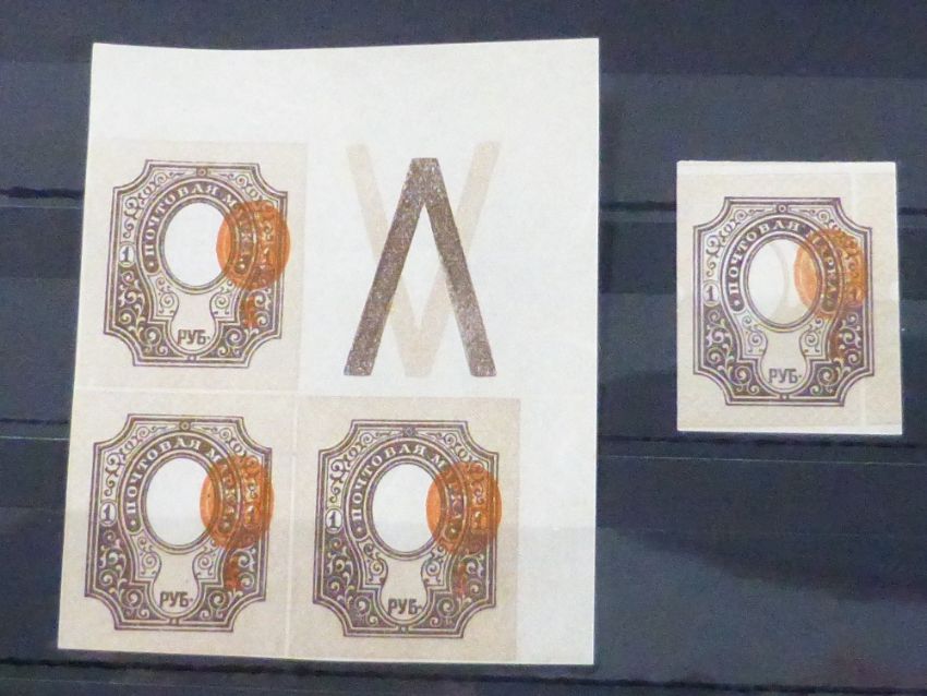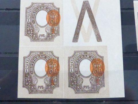 RUSSIA 1889 1R COAT OF ARMS IMPERF VALUES WITH VIGNETTE SHIFT AND FRAME SHIFT ERRORS Card with corner block of 4 three values and label, with print shift to right of central vignette. Second single value with vignette shift to right and frame shunt pair of striking varieties.
