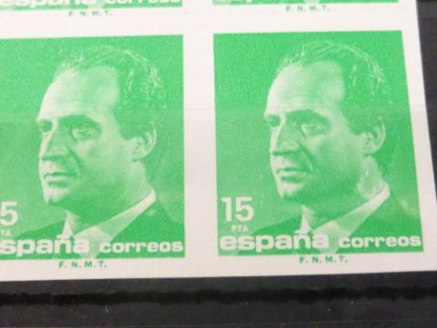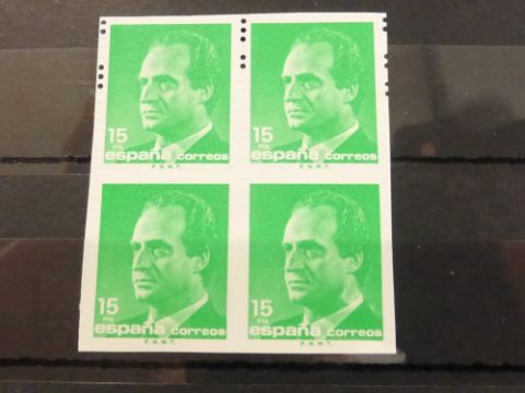 SPAIN 1989 15PTA GREEN MNH BLOCK OF 4 ERROR IMPERF TO LOWER TWO VALUES Uncatalogued error from Spain 1989 (mi2891) Block of 4 of King Juan Carlos with a progressive perf error. Top two values imperf to top but then with blind perfs to middle of block and lower quarter of block appears to be completely imperf. Unmounted mint with full gum to rear.